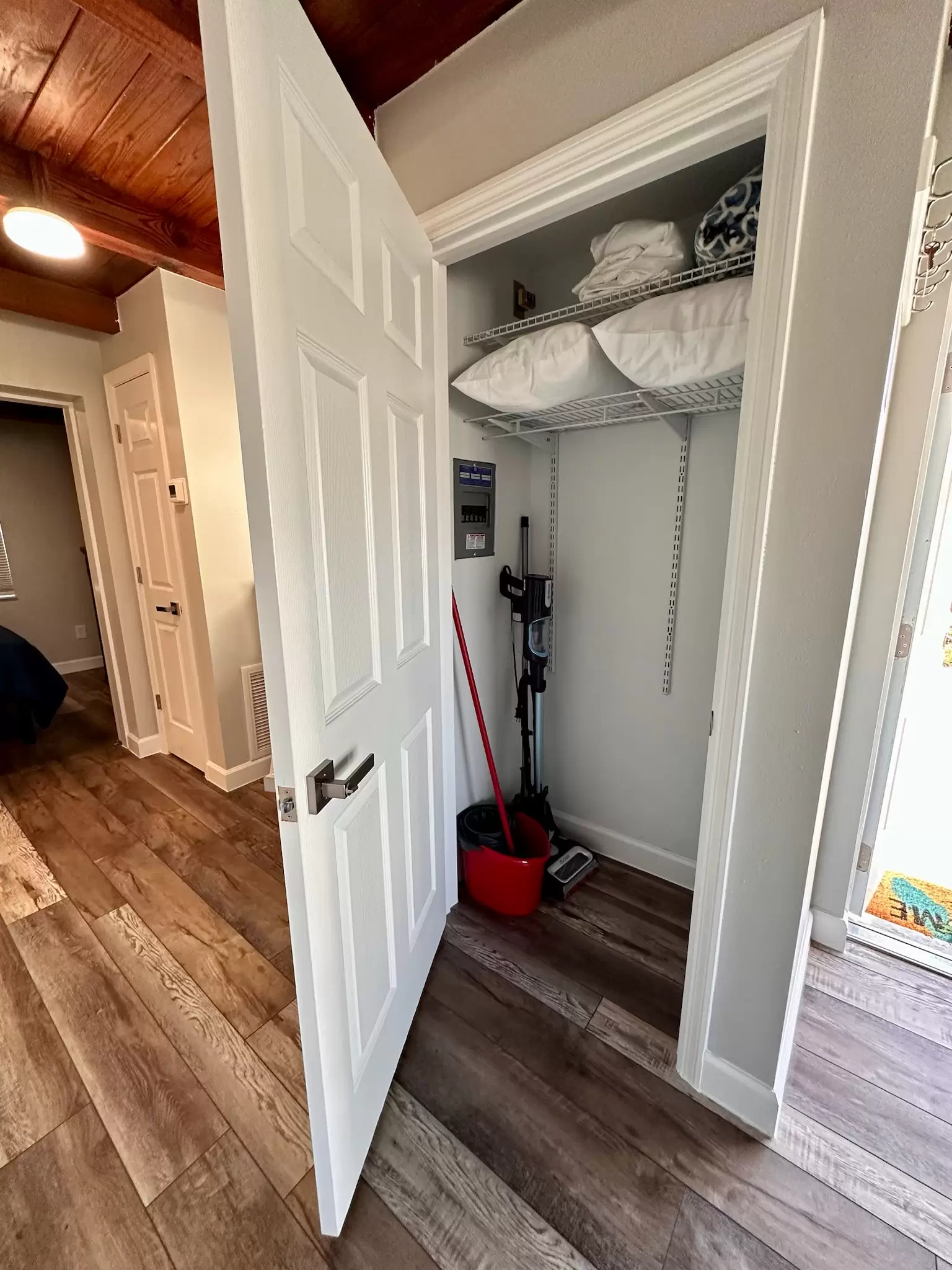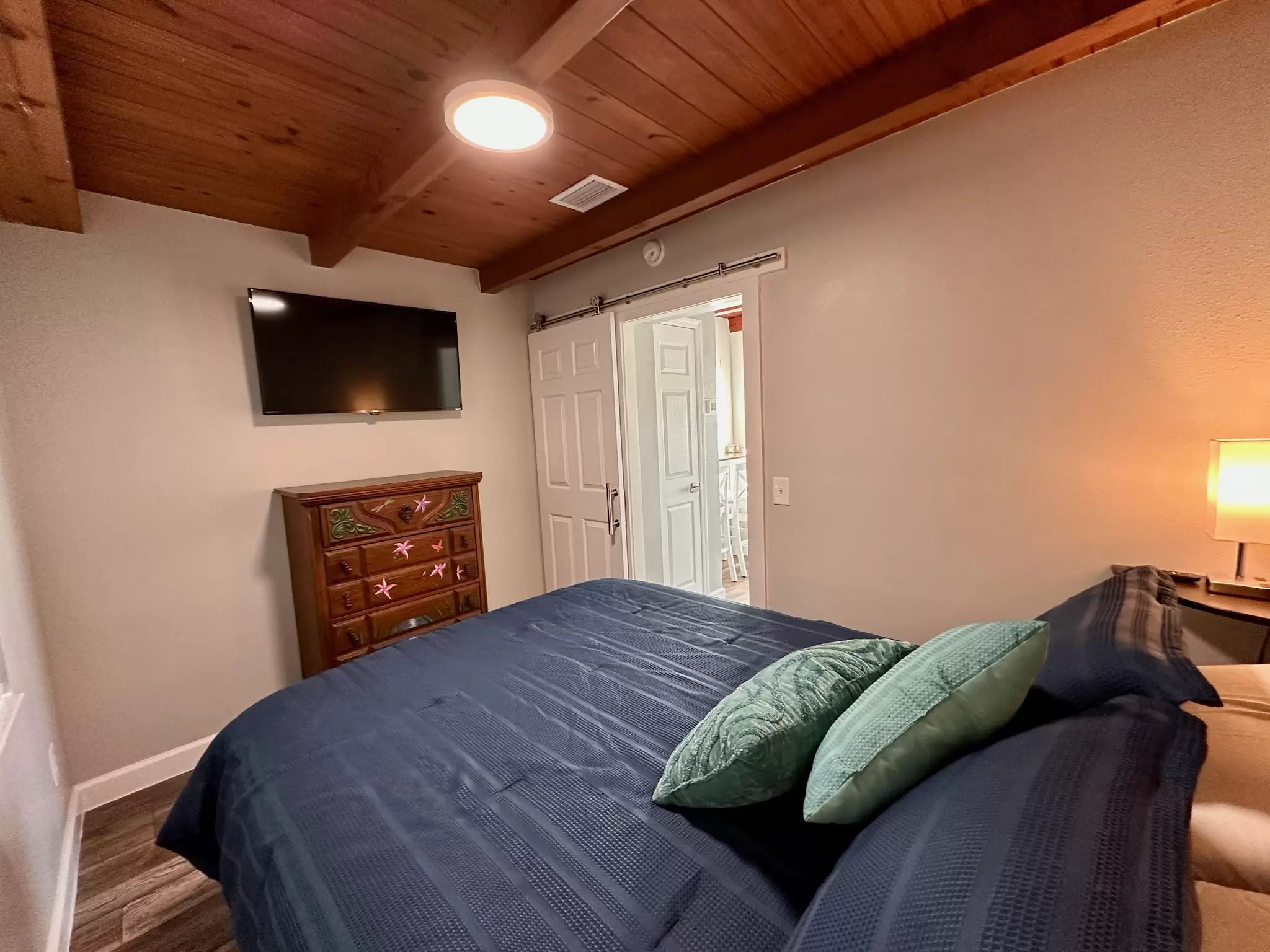 - — Bedroom: One queen bed with fresh linens and pillows, a closet, and a Smart TV.