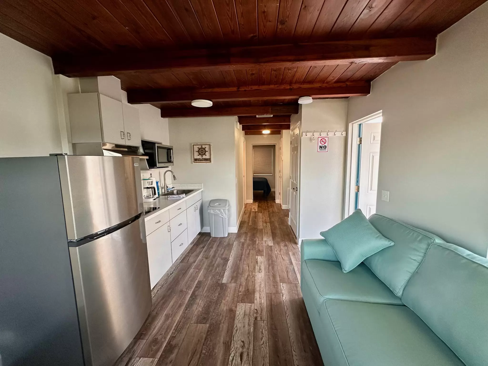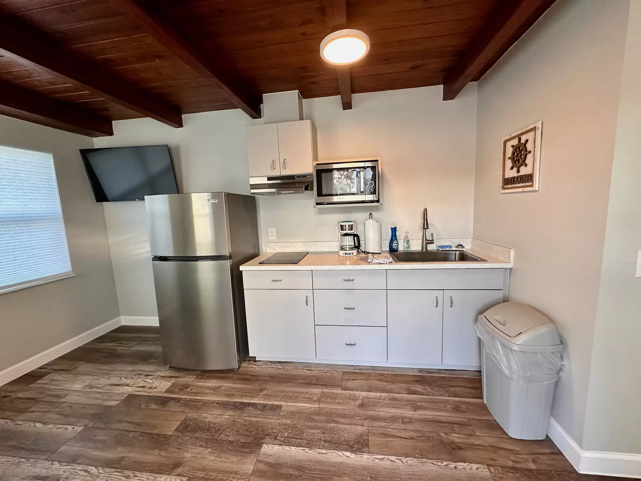 - — Fully Equipped Kitchenette: A kitchenette with a microwave, full-size refrigerator/freezer, induction stovetop, coffee maker, ice maker.