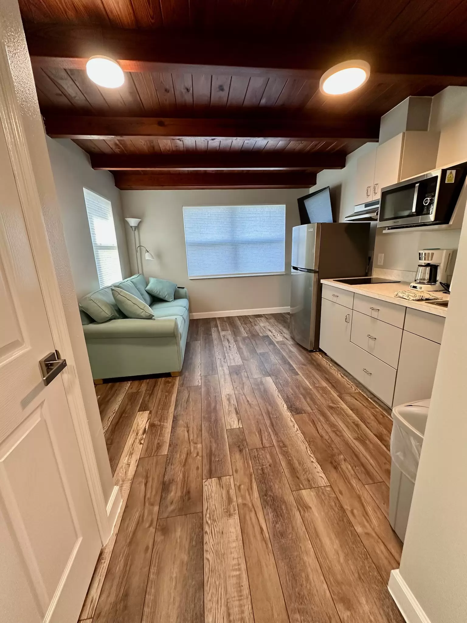 Cozy for 2 people for 2 days. Bed was very comfortable, full refrigerator/freezer and 2 burner glass stove top was nice for cooking breakfast. Everything inside looked new, kit hen sink/faucet, same in the bathroom, and the new vynl flooring was easy on the feet. Quiet neighborhood while we were there. We would definitely stay here again if we ever get back to Tavares. Everything we needed was only a 6 to 7 minute drive, convenient..