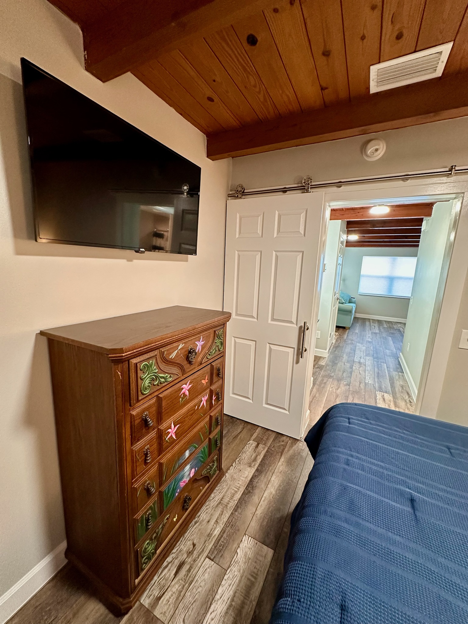 - — Bedroom: One queen bed with fresh linens and pillows, a closet, and a Smart TV.