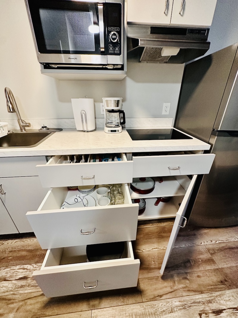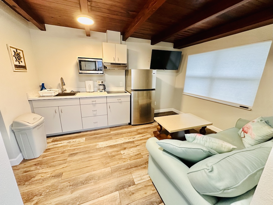 Cozy for 2 people for 2 days. Bed was very comfortable, full refrigerator/freezer and 2 burner glass stove top was nice for cooking breakfast. Everything inside looked new, kit hen sink/faucet, same in the bathroom, and the new vynl flooring was easy on the feet. Quiet neighborhood while we were there. We would definitely stay here again if we ever get back to Tavares. Everything we needed was only a 6 to 7 minute drive, convenient..