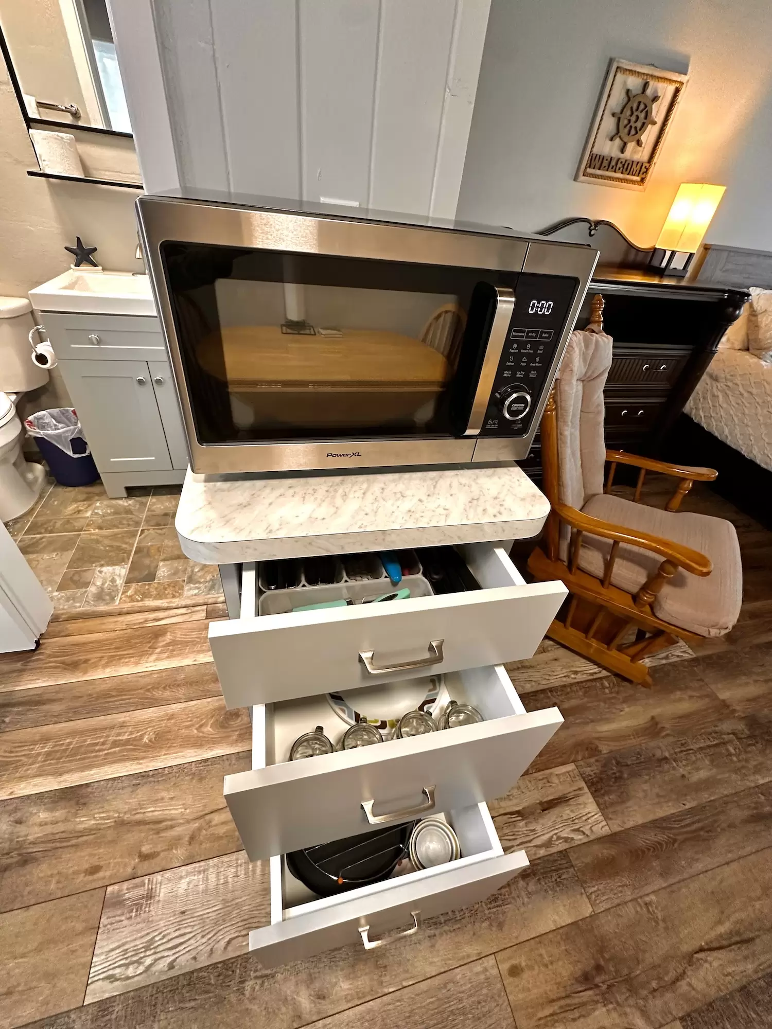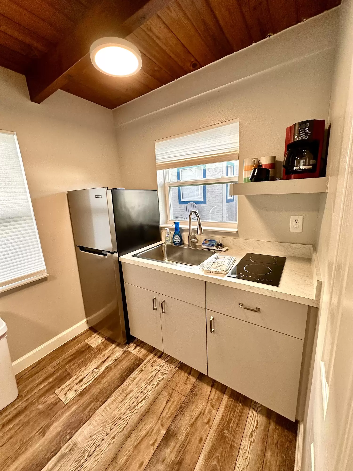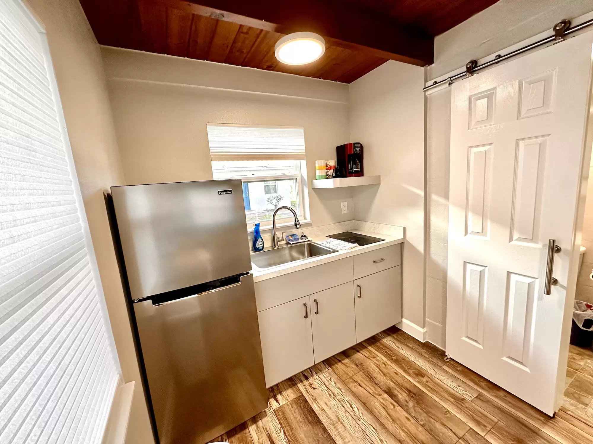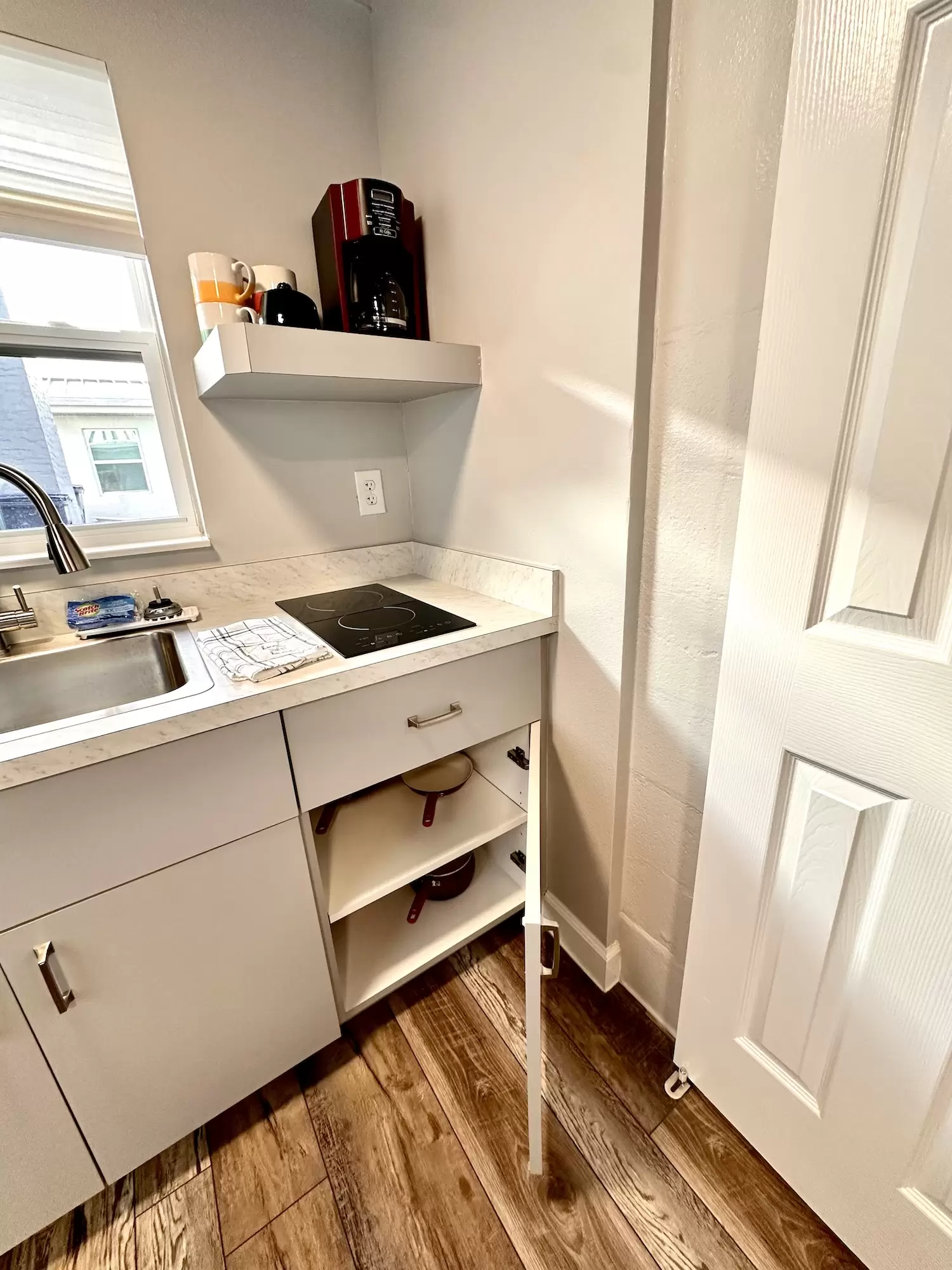- — Fully Equipped Kitchenette: A kitchenette with a microwave, full-size refrigerator/freezer, induction stovetop, coffee maker, ice maker.