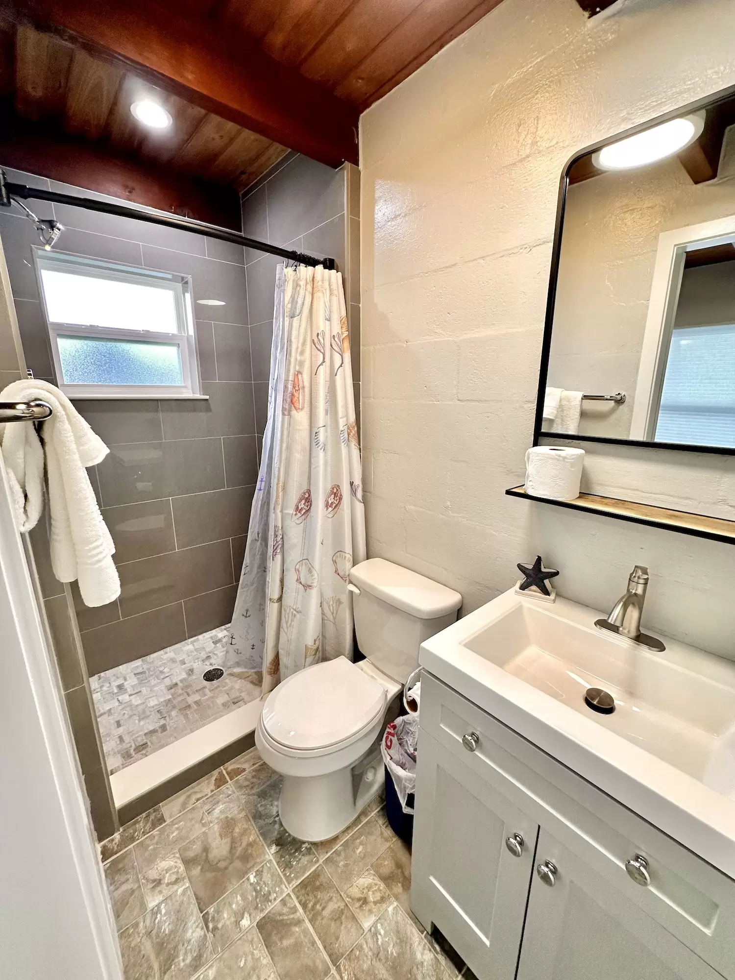 - — Bathroom: Walk-in shower with bath linens and toiletries, such as towels, washcloths, hand towels, hand soap, bath mat, toilet paper, etc.