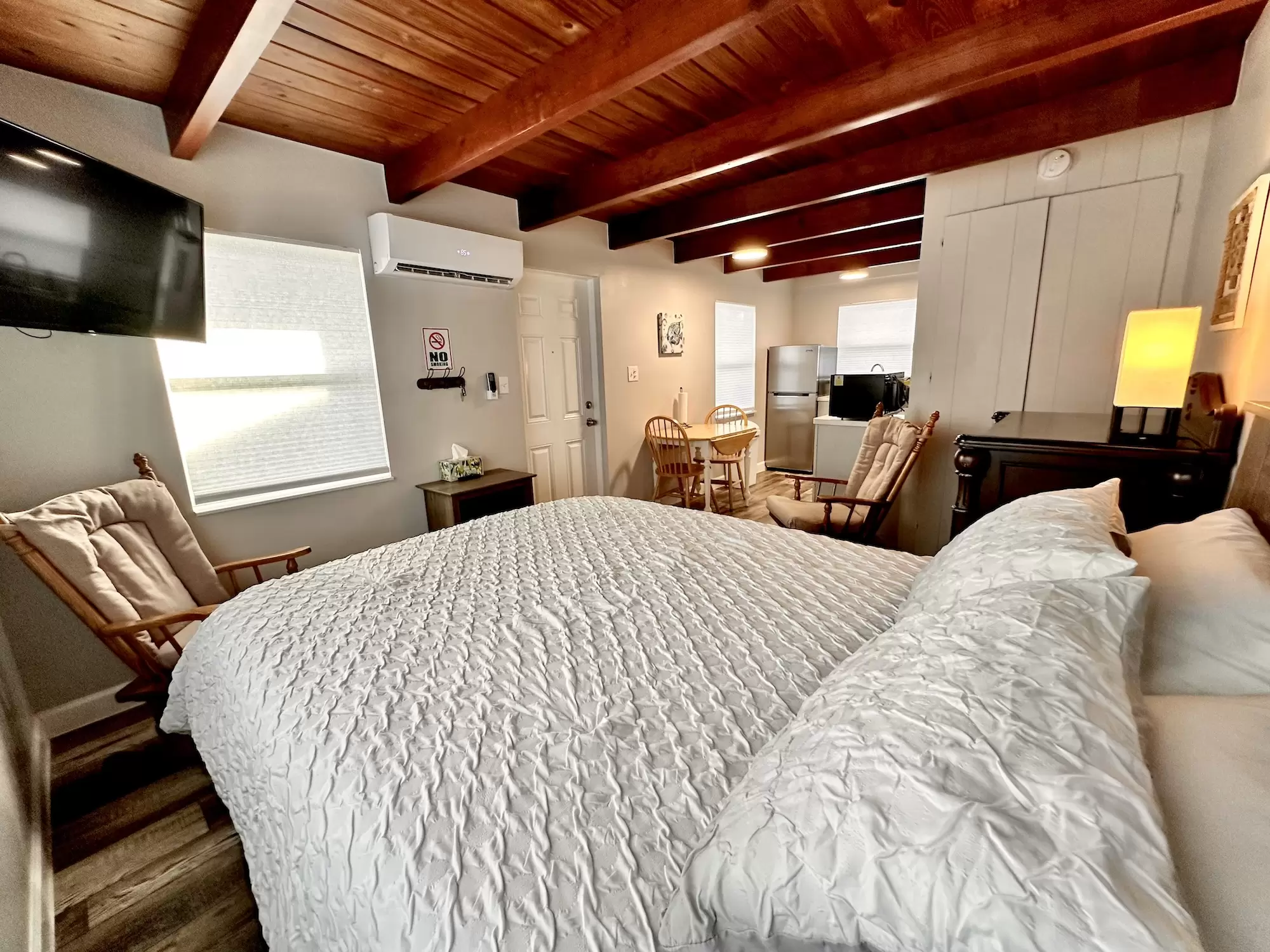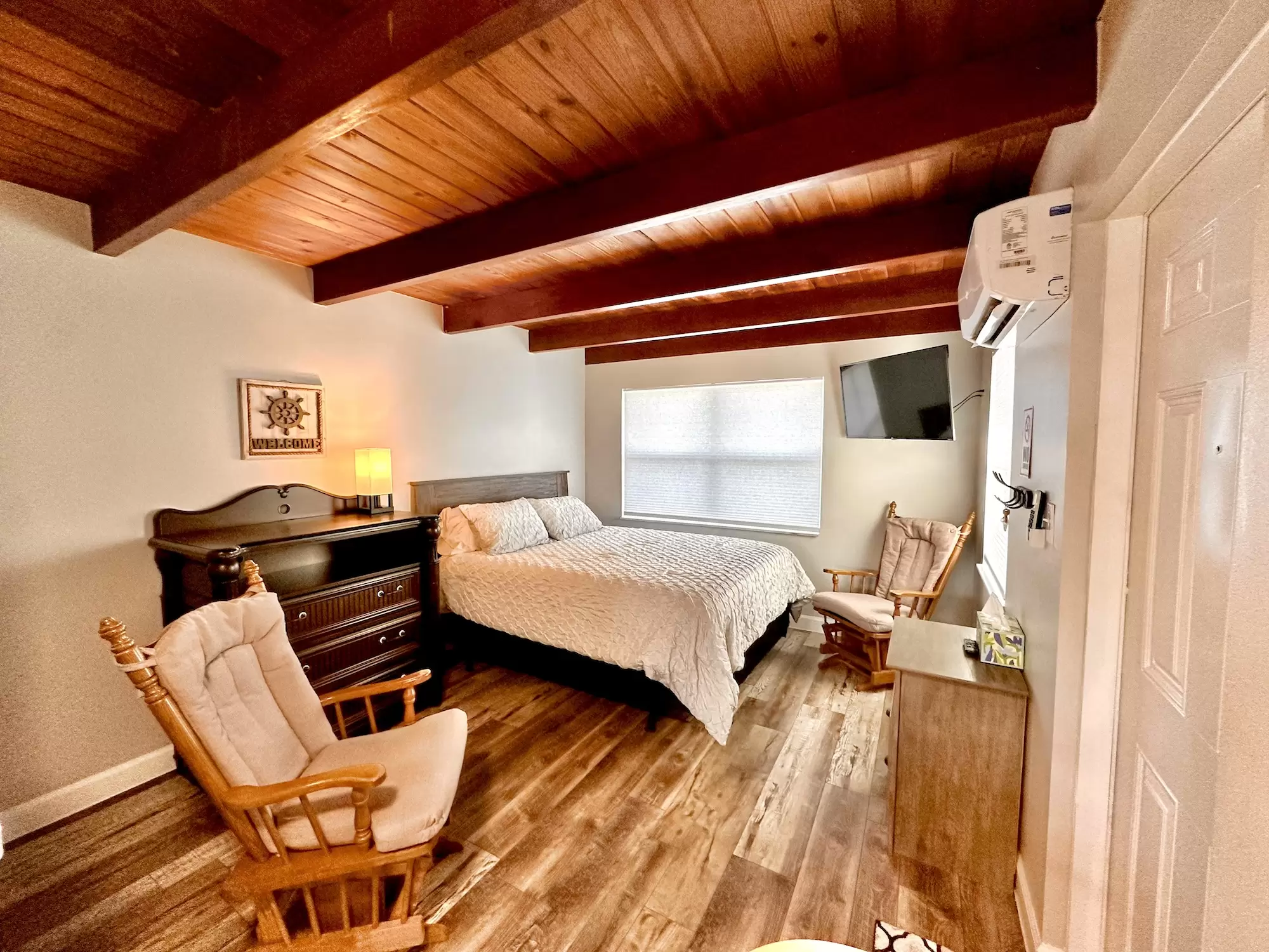 - — Bedroom: One queen bed with fresh linens and pillows, a closet, and a Smart TV.