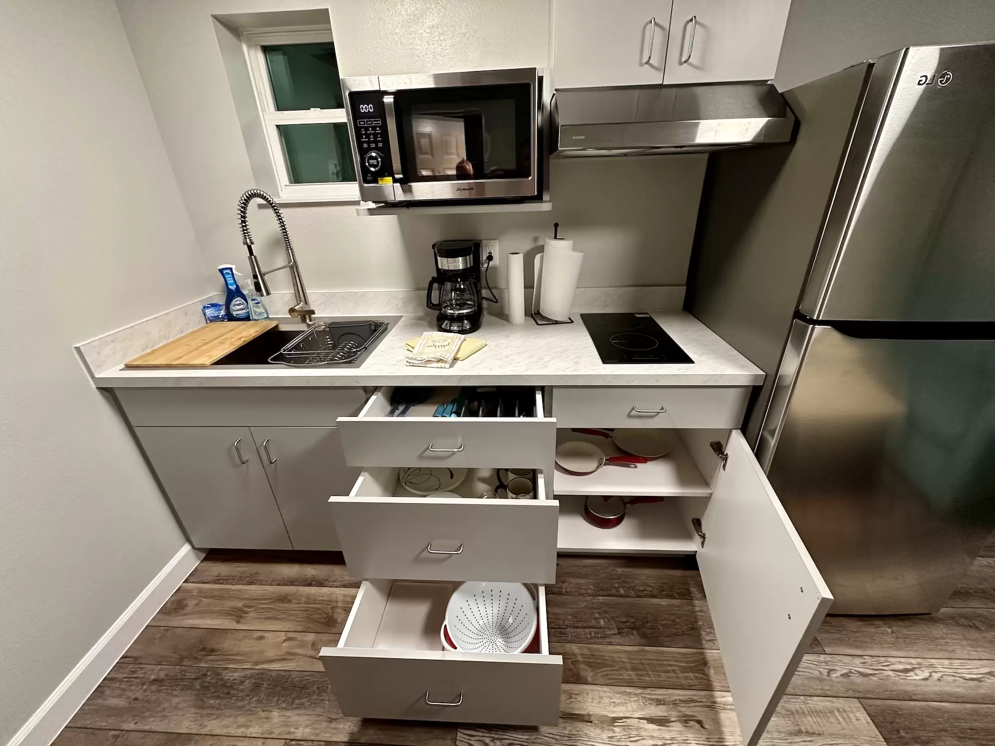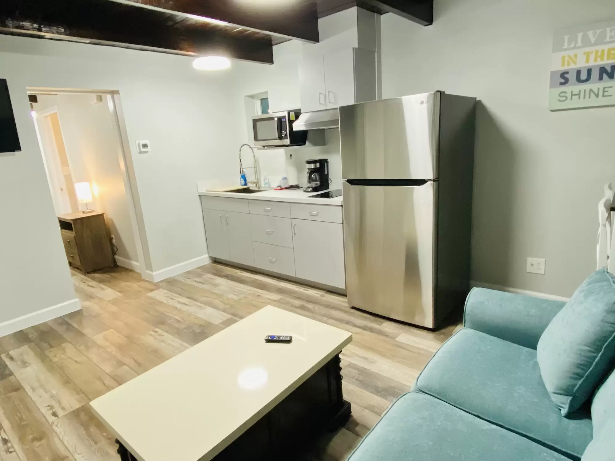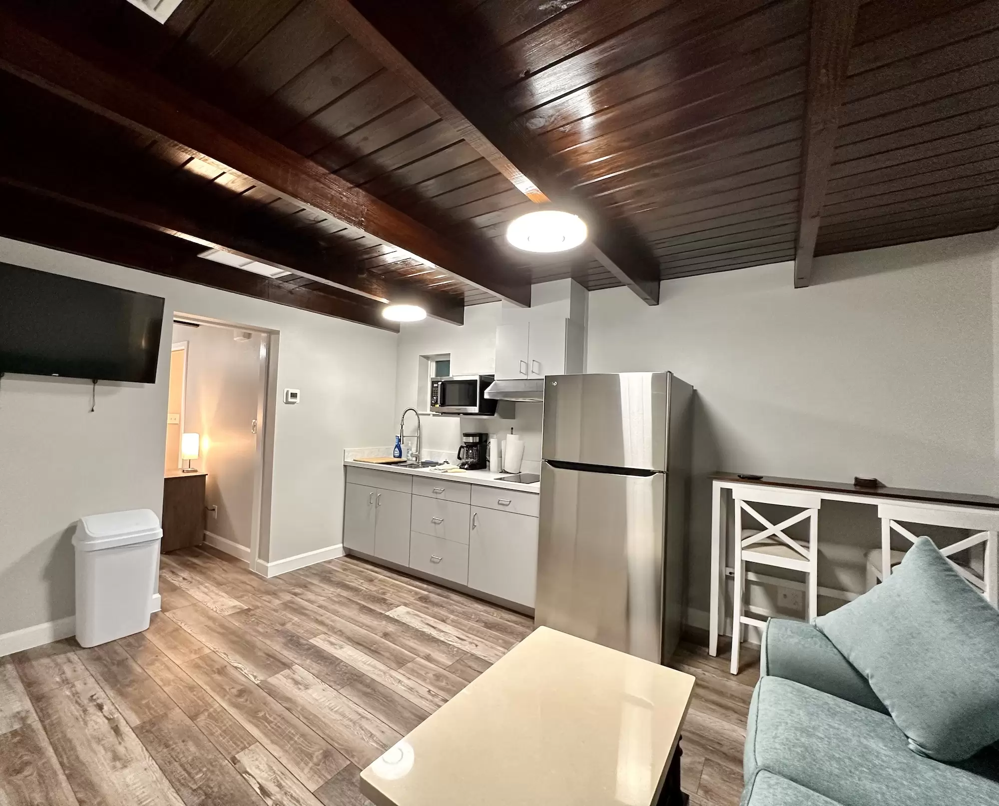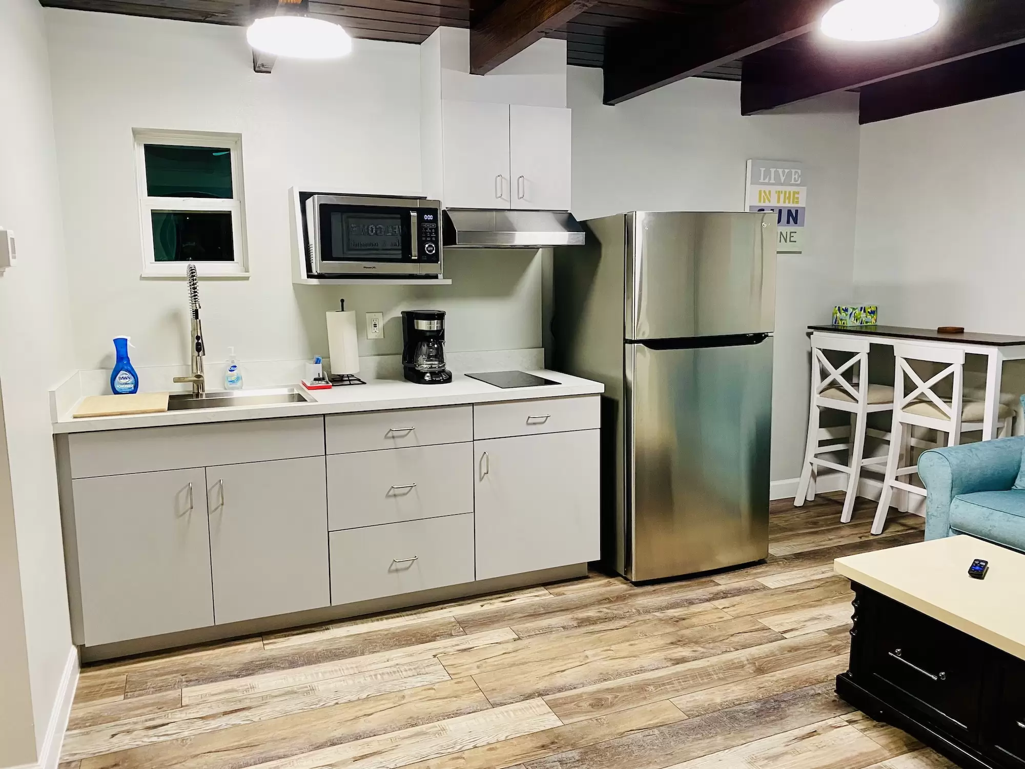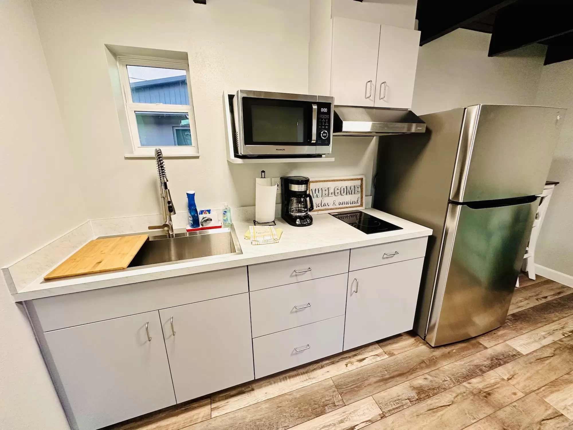 - — Fully Equipped Kitchenette: A kitchenette with a microwave, full-size refrigerator/freezer, induction stovetop, coffee maker, ice maker.