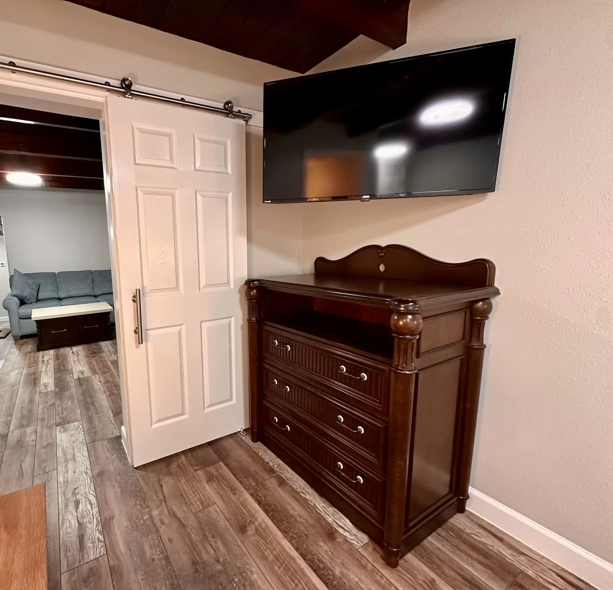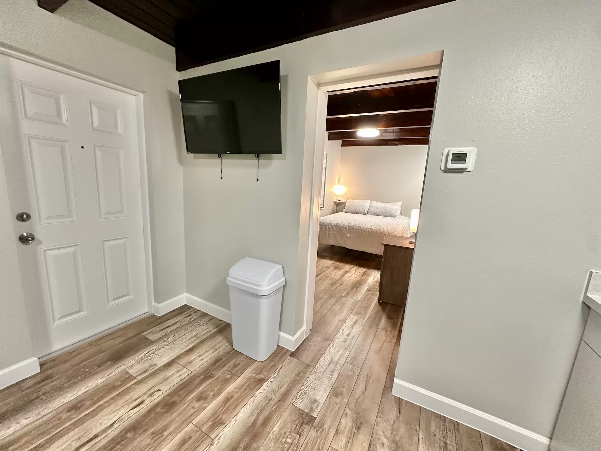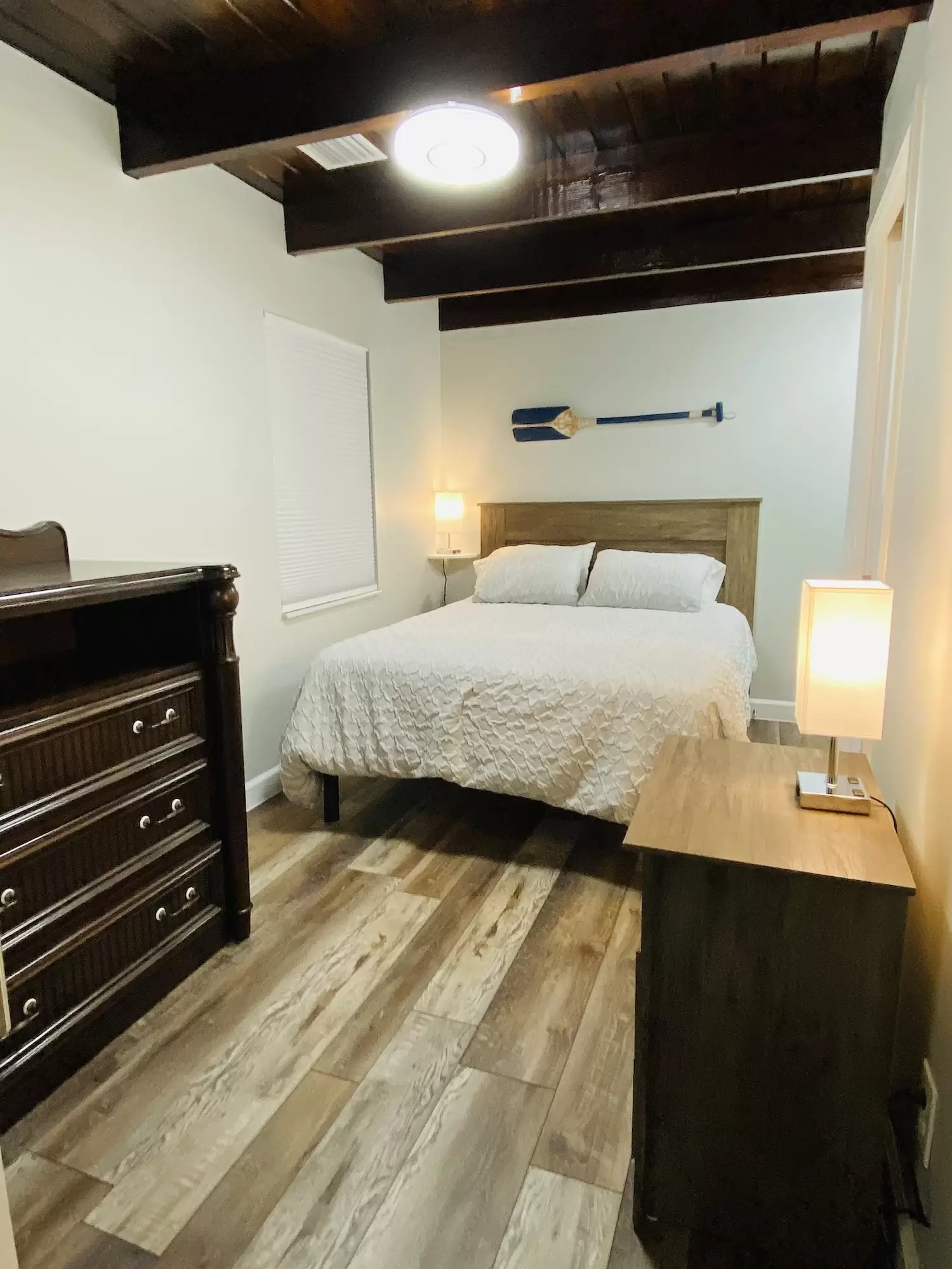 - — Bedroom: One queen bed with fresh linens and pillows, a closet, and a Smart TV.