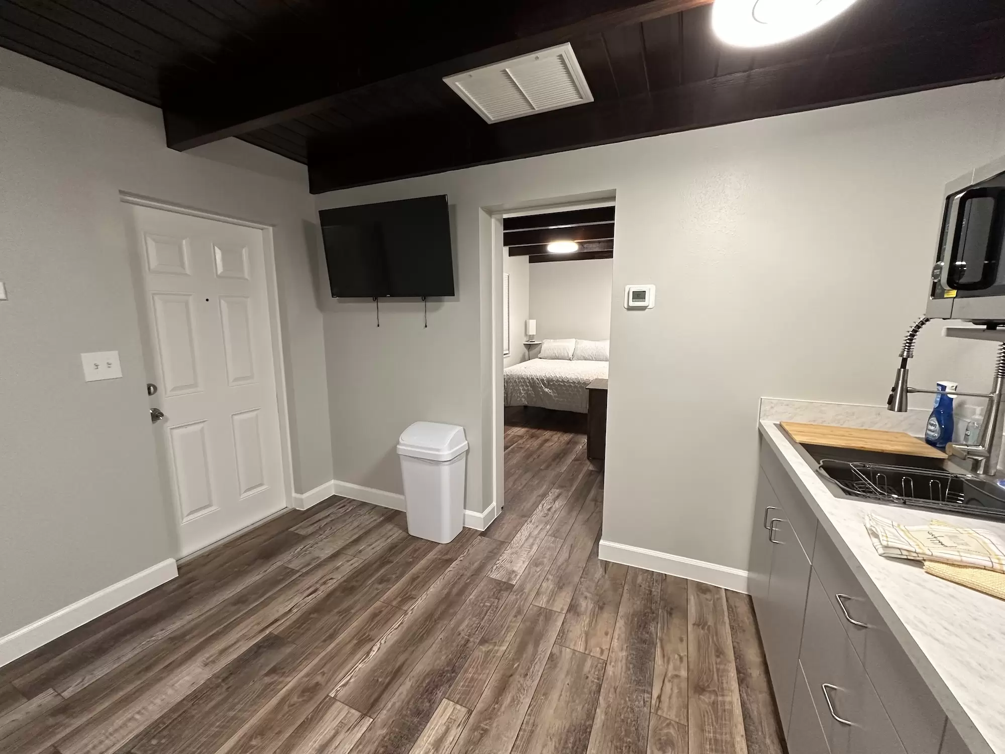 Cozy for 2 people for 2 days. Bed was very comfortable, full refrigerator/freezer and 2 burner glass stove top was nice for cooking breakfast. Everything inside looked new, kit hen sink/faucet, same in the bathroom, and the new vynl flooring was easy on the feet. Quiet neighborhood while we were there. We would definitely stay here again if we ever get back to Tavares. Everything we needed was only a 6 to 7 minute drive, convenient..