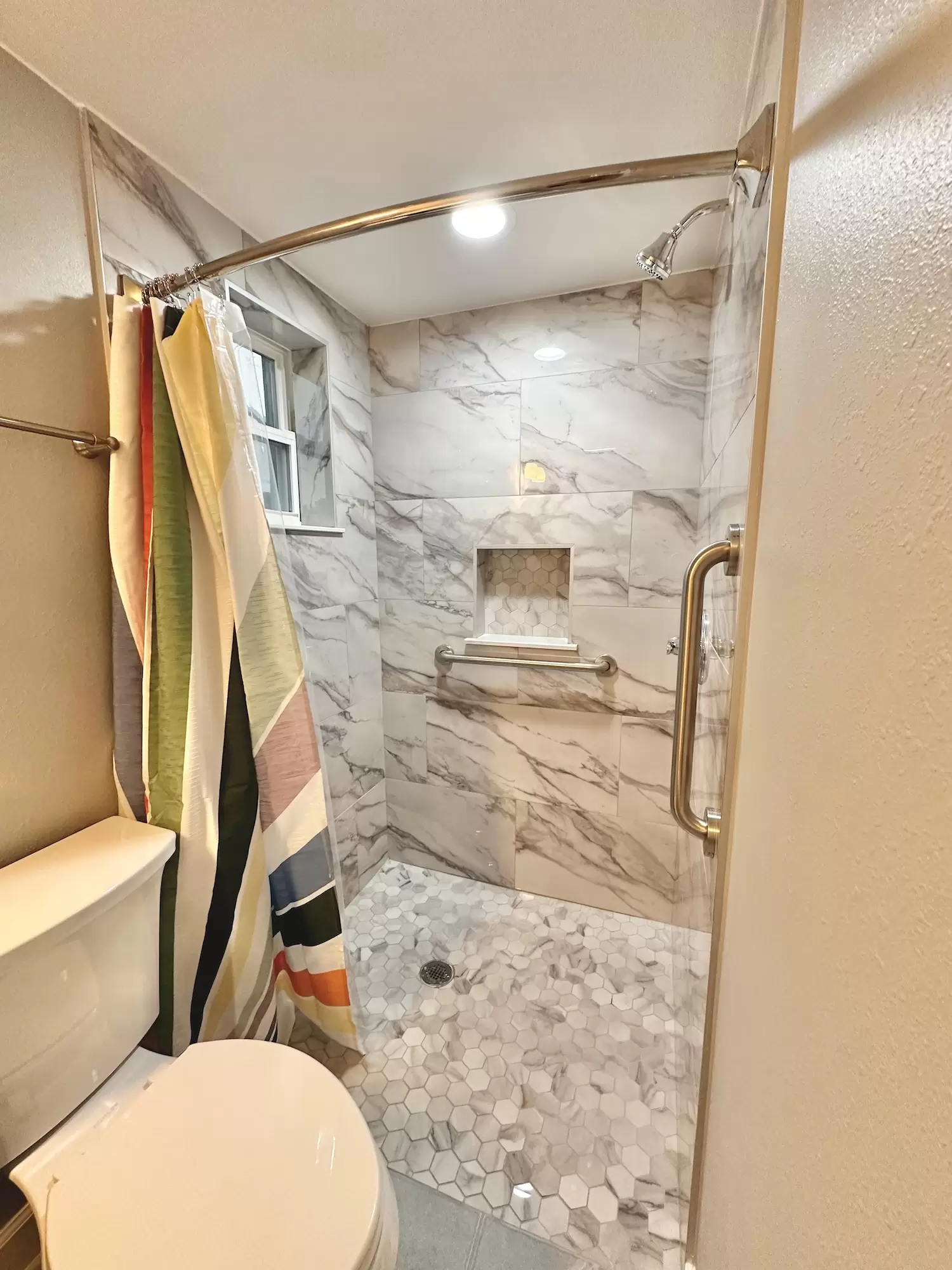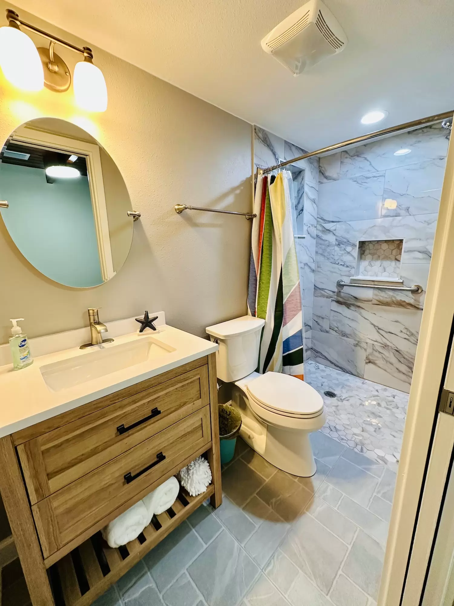 - — Bathroom: Walk-in shower with bath linens and toiletries, such as towels, washcloths, hand towels, hand soap, bath mat, toilet paper, etc.